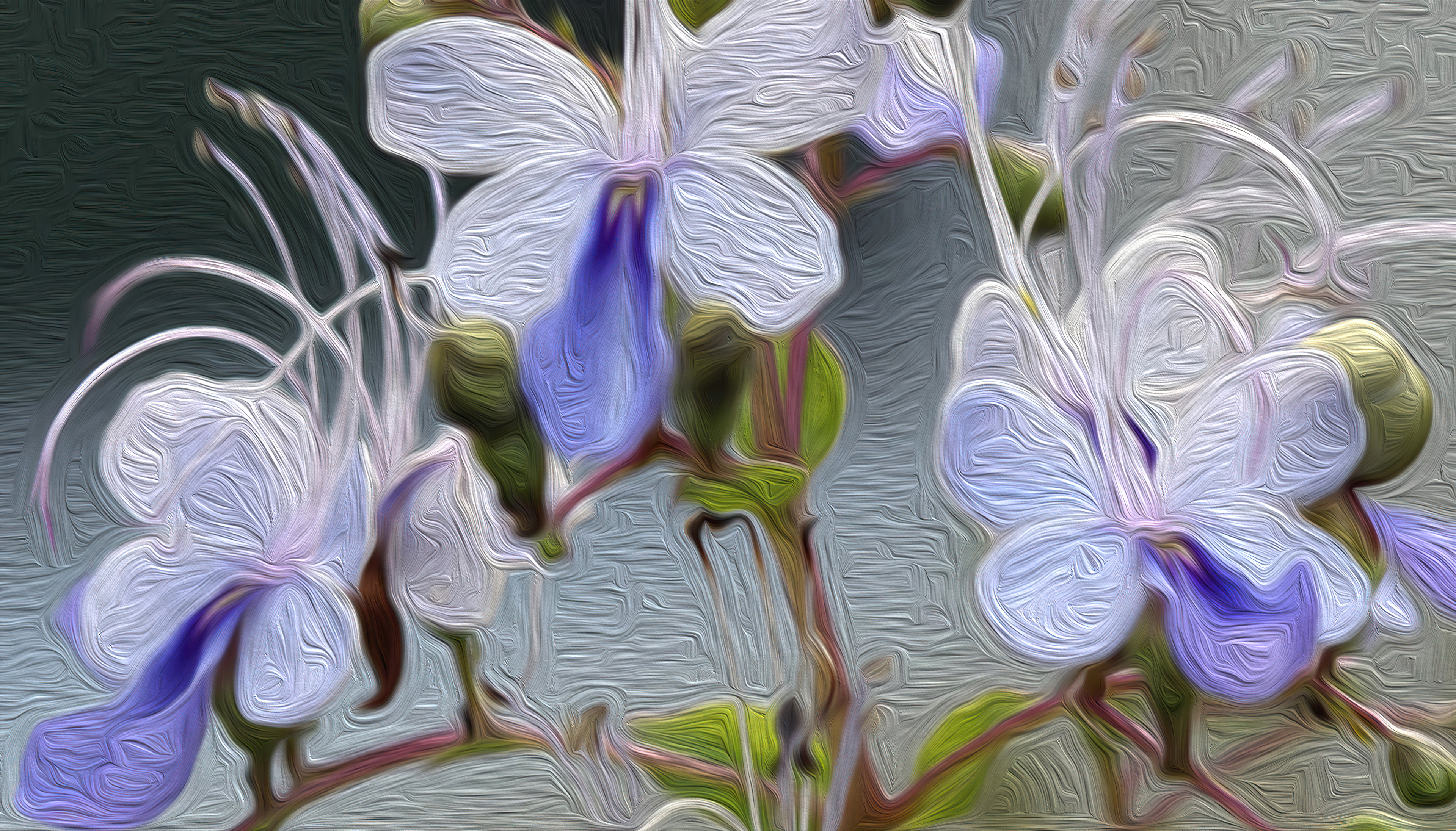 The delicate blooms are softly hued in shades of blue, lilac and cream and are set against a beautiful background of dusty blues and grays.