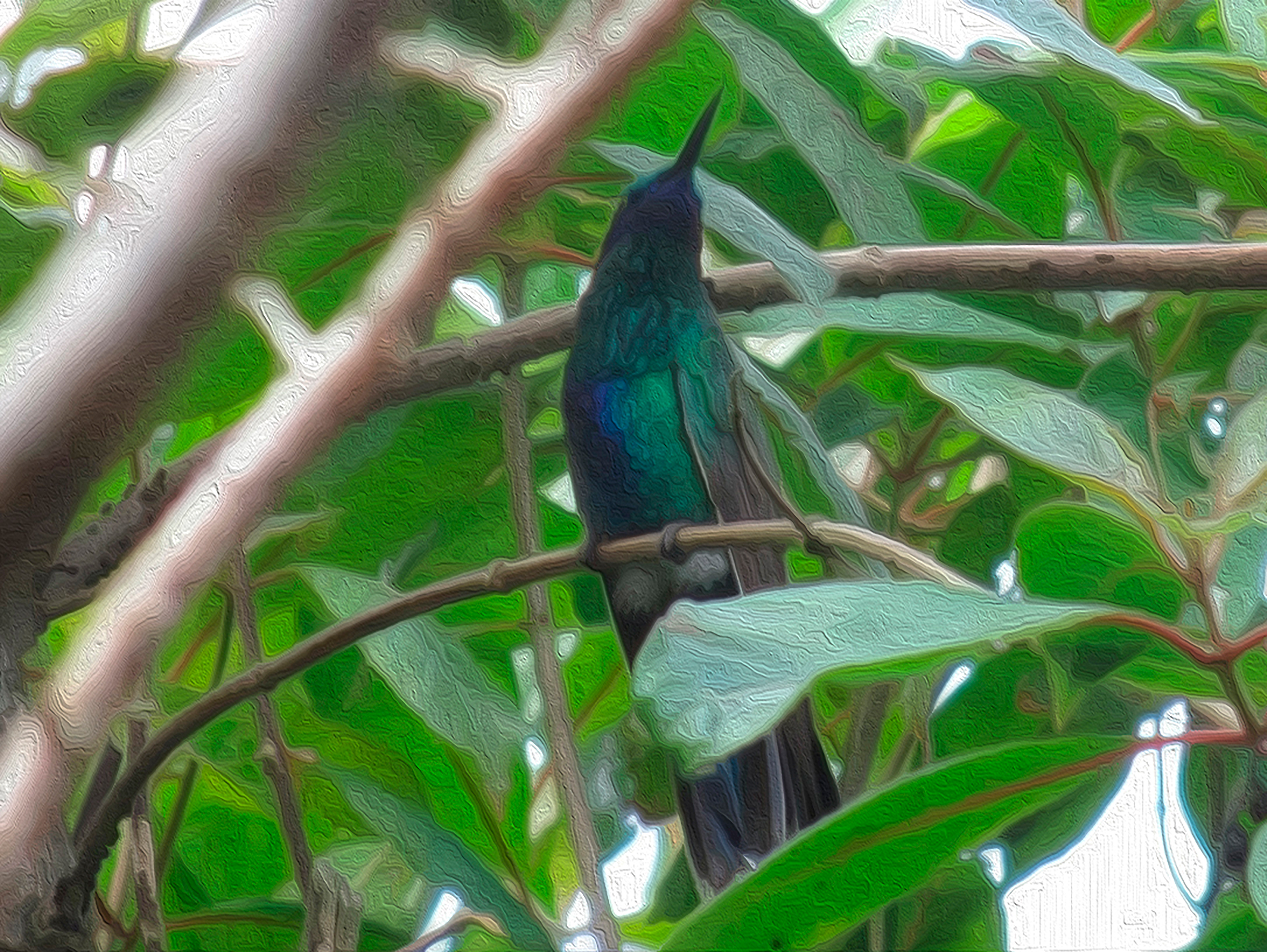 The beautiful blue bird is colored in shades of blue and teal. The background is a misty scene and is full of foliage in many shades of green.