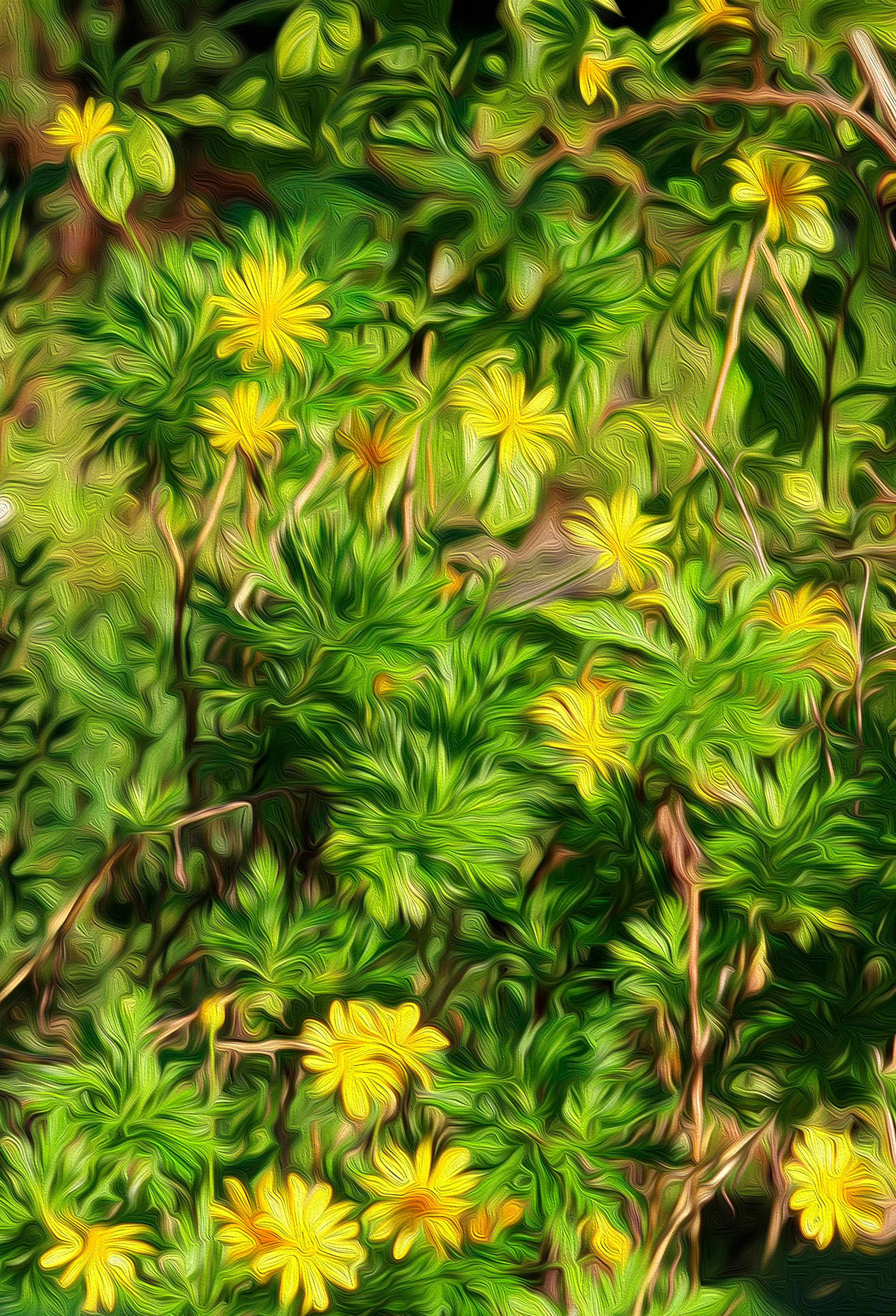 The yellow daisies are set against thick green foliage and look like yellow and green swirls.