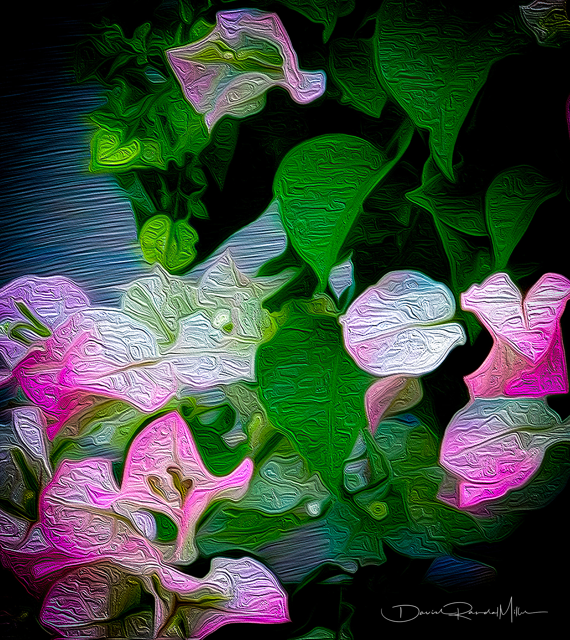 Full of vivid pink and green with a highly textured background in shades of blue and grey. It invokes time spent in a tropical clime with cool breezes on the veranda.