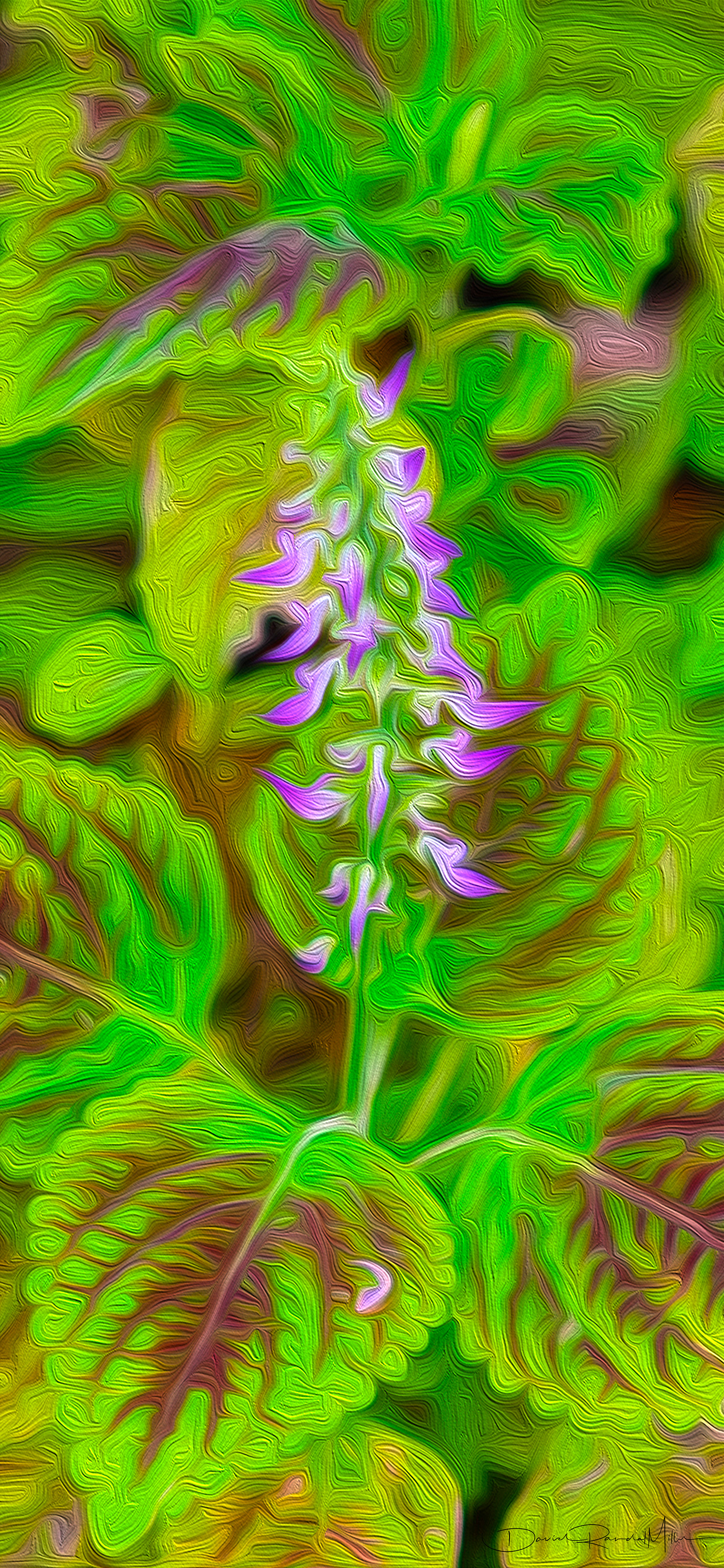 The coleus leaves are brightly colored in shades of lime green and dark maroon and the bloom is a luminous lilac purple. This piece has a luminous quality and is an eye-catcher.