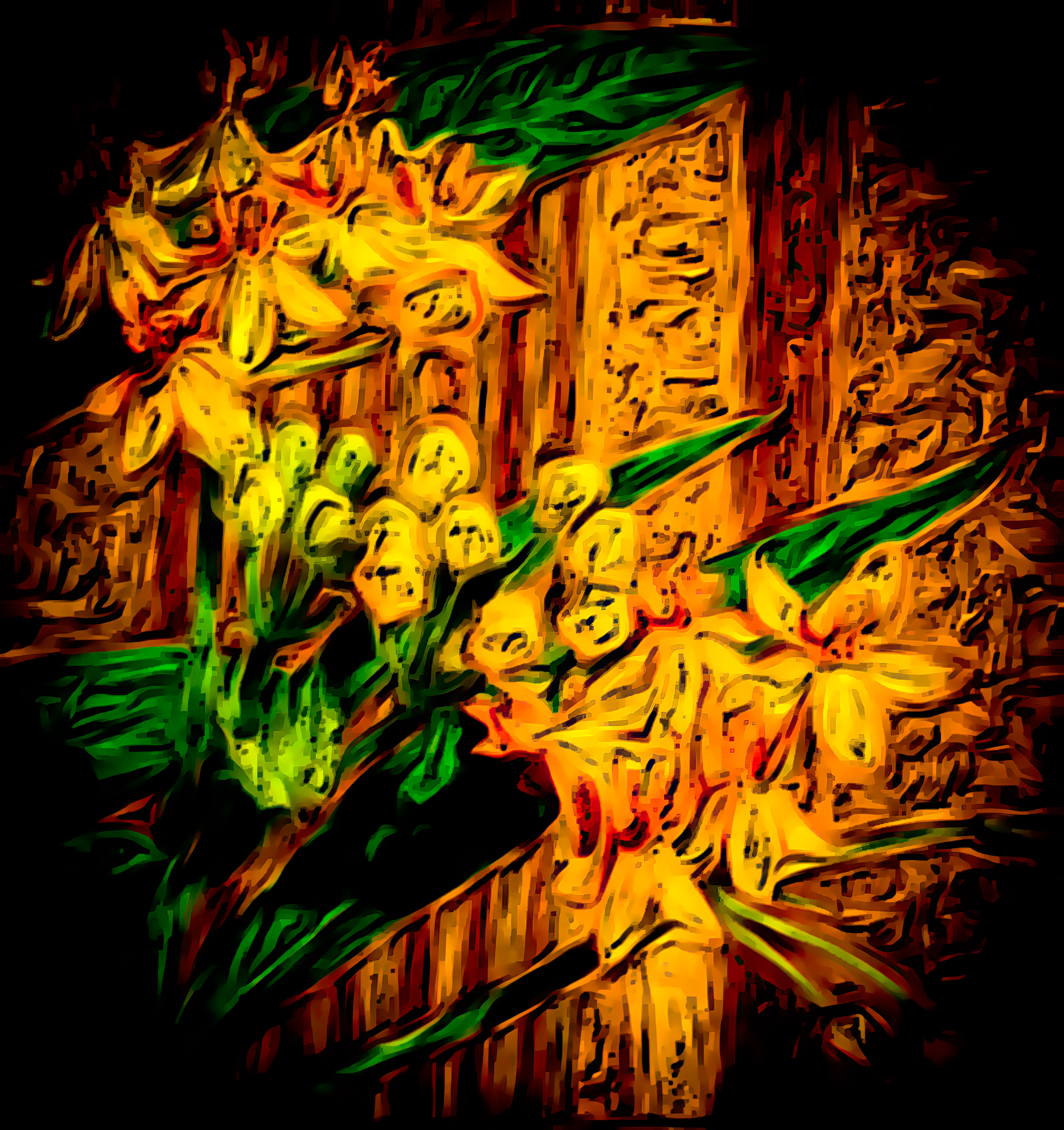 The piece is highly stylized and full of texture. Bright yellow and golden tones predominate with rich green foliage accents. This a large piece with bright, eyecatching colors and textures.